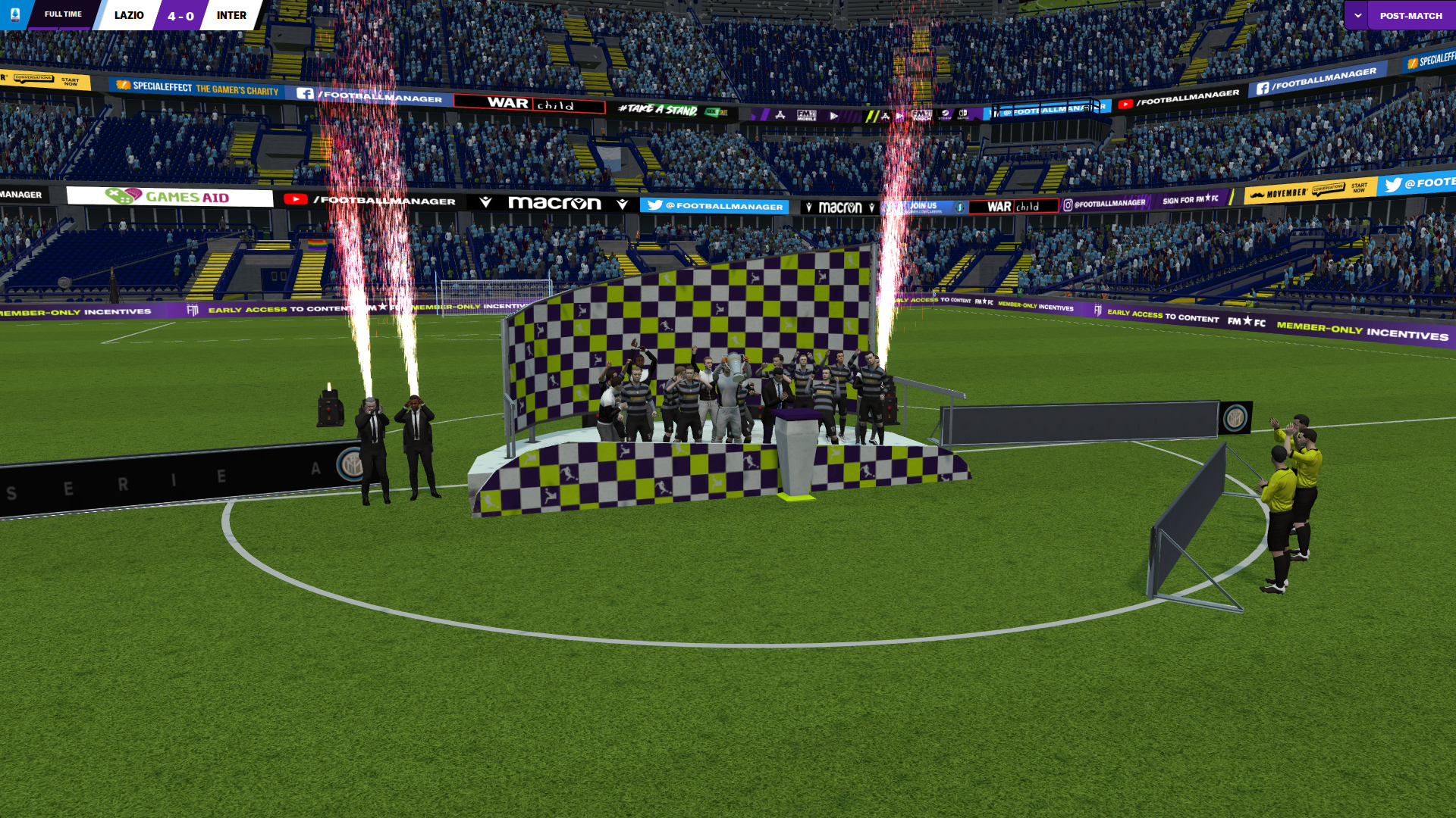 With that dream over all that’s left to do is clinch the title. Here’s our run of league results after a 1-1 with Cagliari in March. 6-2 vs. Udinese, 3-0 vs. Crotone, 2-2 with Parma (accusations of bottling in the chat), 7-1 vs. Sassuolo, 2-0 vs. Fiorentina and 3-0 vs. Sampdoria. With Milan in desperate need of a win we clinch the title by watching Roma and Milan draw 0-0. It’s over with four in hand and we lift the trophy in Rome after being obliterated 4-0 by Lazio. Everyone clearly hungover at this point.
