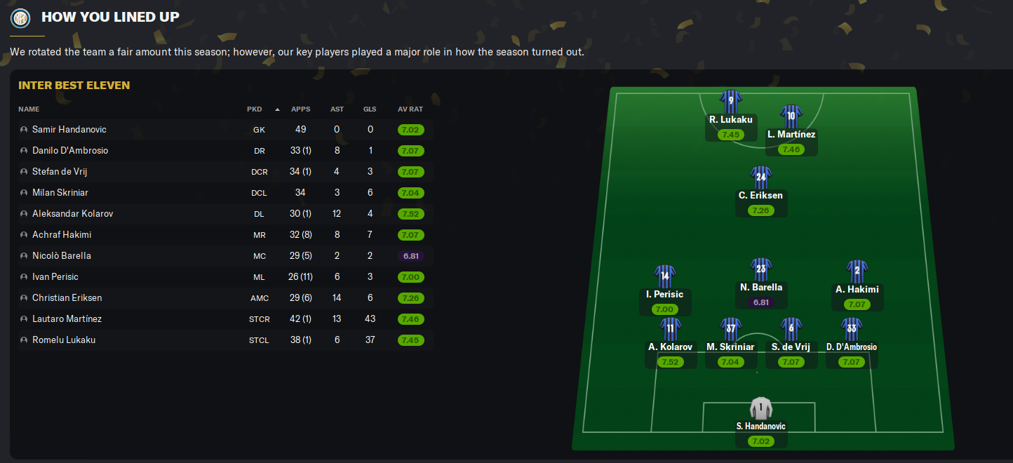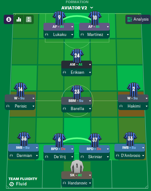 On the original Glory Hunter that Benjy did for FM20 he started at Inter Milan and I’ve been itching to try out my formation with the Inter side because I think Lukaku, Lautaro, Eriksen, Barella, De Vrij and Skriniar is an incredible backbone for it. The wide areas are less good but they’re also less key to how my formation works. Here’s the starting XI: