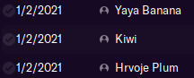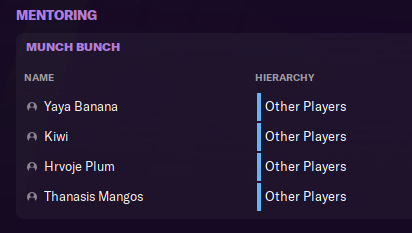 The “Banana” option leads to me signing Yaya Banana on a free transfer. One thing leads to another and after much giggling we have a bunch of fruit-named players. Banana is joined by Kiwi (no last name), Plum and Mangoes. Micky Mellon isn’t available sadly but I get Ian Mellon in as a sports scientist. “Can you make him a nutritionist” asks Chris Parker in the chat. I wish I could.