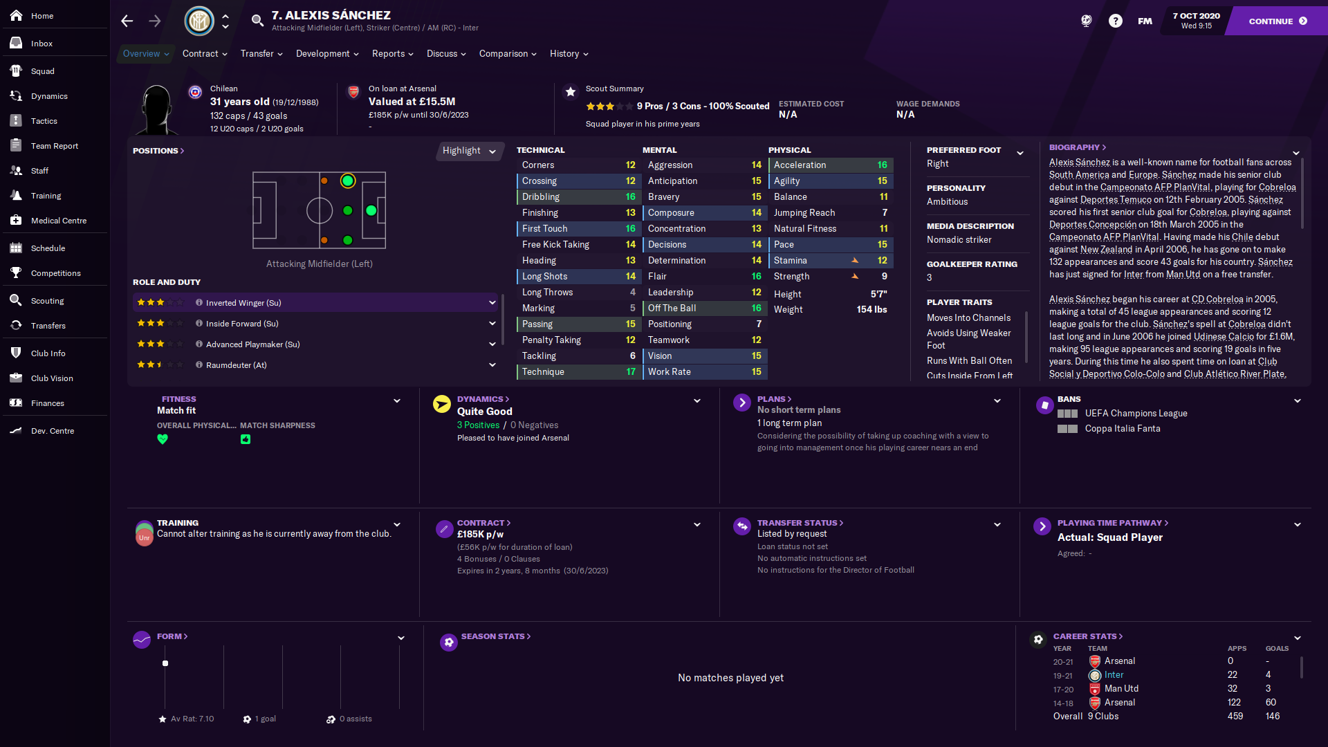My first issue at Inter is discovering, or rather remembering, that you’re only allowed 25 players in your squad and four of them have to be homegrown or you’re screwed. My first squad doesn’t include Alexis Sanchez and boy is he not happy about it…so I loaned him back to Arsenal!