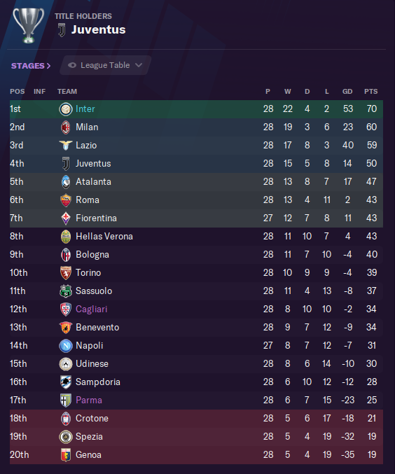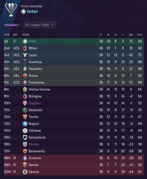 This is how Serie A finished. A huge winning margin and we crushed the league. Shame about the cups but hey, you can’t have it all. It’s great to get off to a winning start and chalk off one of the Big Five league wins.