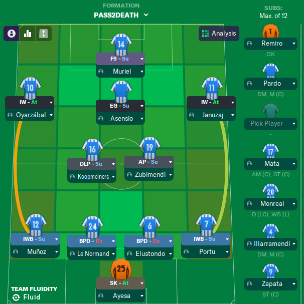 Here’s how the starting lineup changed* and it paid off, big time. First game versus Real Valladolid finished 4-0. Zapata and Januzaj both got braces. Not the kind that hold up your trousers. We crushed them. I even took players off to rest them for the last half hour. IN MY FIRST GAME.