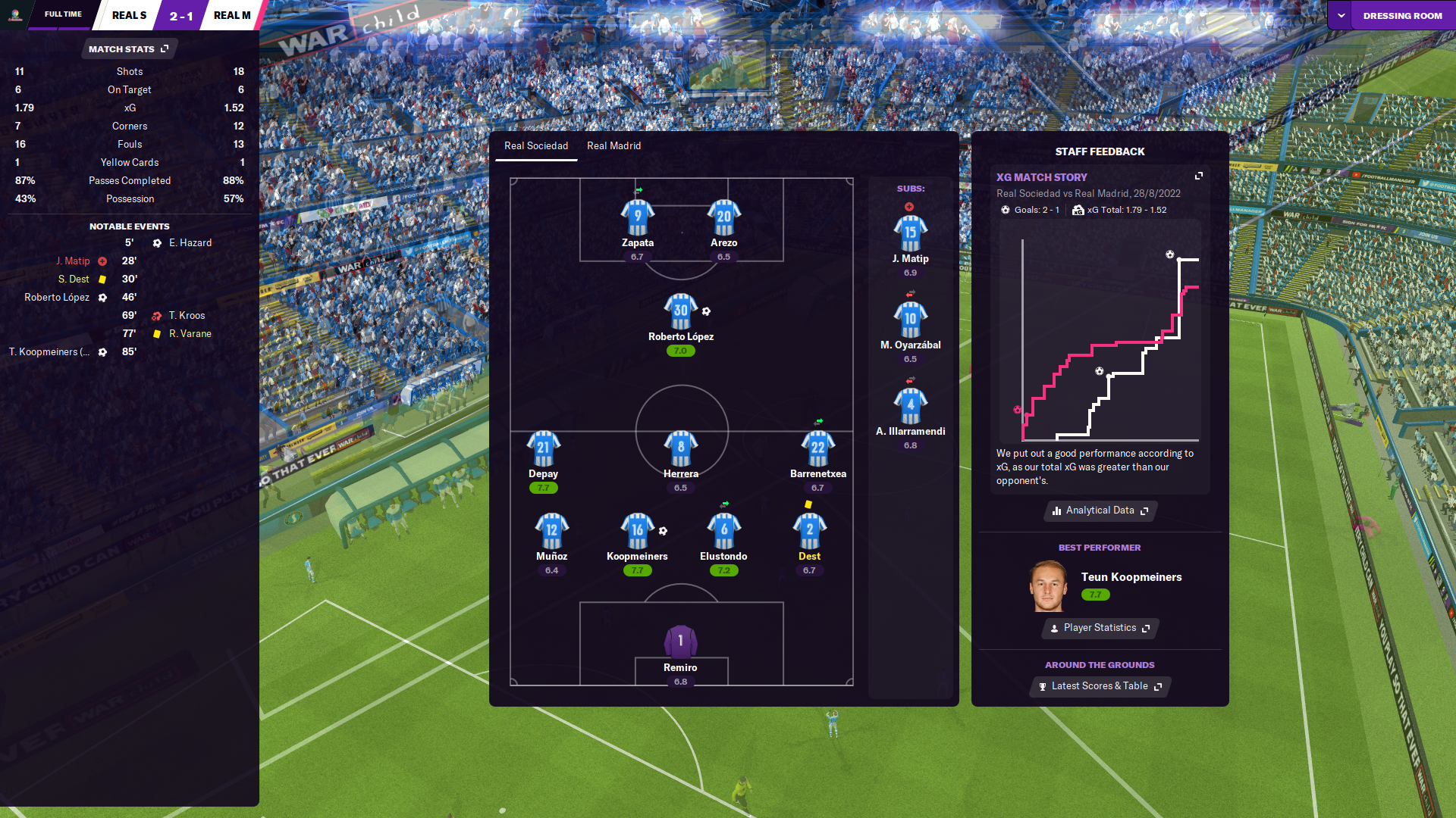 This is our first big test. Madrid are a giant club. They have world class players in every position. I can’t play Asensio because he’s a Madrid player. It’s a big challenge. We start out playing the possession tactic and it backfires. Madrid score early through Hazard and we’re just too defensive. We’re allowing Madrid onto us. I made a bold substitution, putting on a forward for a defensive midfield player after 20’ and eventually it pays off. Bobby Lopez fires in a sensational volley on 46’ and Kimpembe, who we tried to sign and refused to talk to us, gives away a late pen. Koopmeiners takes it and bests Courtois. What a sensational win this was. We proved we could hang with the big boys.