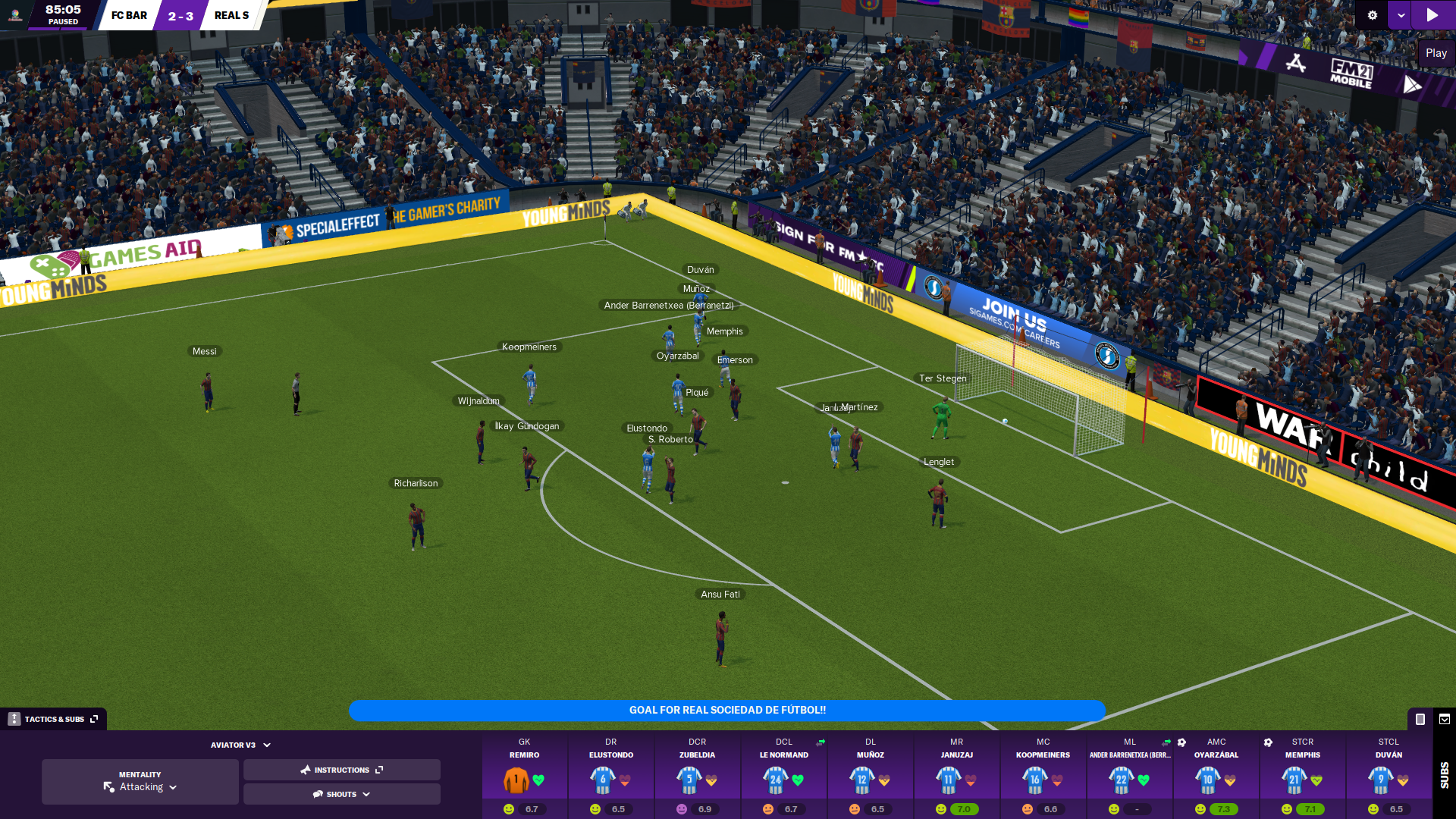 All that’s required is a draw here and Sociedad win their first title since 1982. The first half is a complete disaster if I’m honest. One of their lads dives for a penalty, which the ref gives despite looking at VAR. In my head my little avatar fella on the sidelines is on the fucking pitch at this point and I’m pretty sure would have been sent off for calling the ref a coño. He awards us a penalty to level things up, and because he doesn’t want me screaming at him again, and Oyarzabal misses the target completely. Oh no, is the FMing I’ve been waiting for? 1-0 HT.