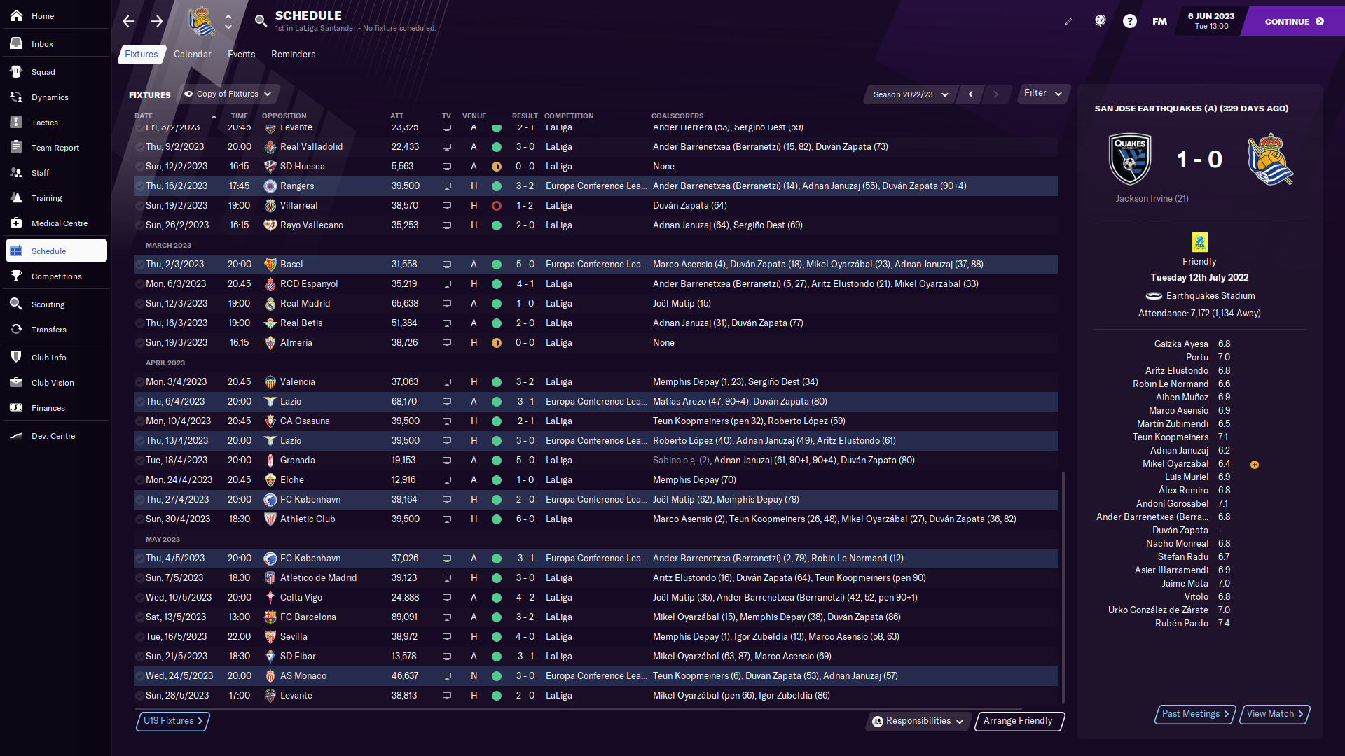 As you can see there are four games left and Sociedad are top of the league. We did the double over Real Madrid and have only lost three games this season. However, Barcelona are breathing down our necks and the next game is at the Nou Camp. This is the season. In Conference League action we’ve made the final. We knocked out Lazio and Kobenhavn in the last couple of rounds and we’ve looked like the best team in the competition. Final is against Monaco. Oh, the Copa del Rey? We don’t talk about that.