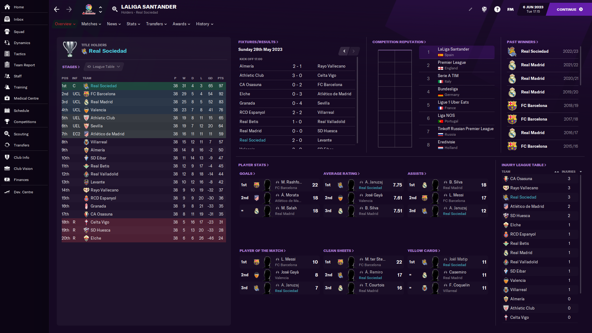 Welcome to Sociedad! Sunny northern Spain is our third location on this jaunty trip around Europe collecting trophies. Sociedad had a rough campaign last season and finished outside the major European places in 7th. My task is to push on towards European football and maybe unsettle the big boys in the process