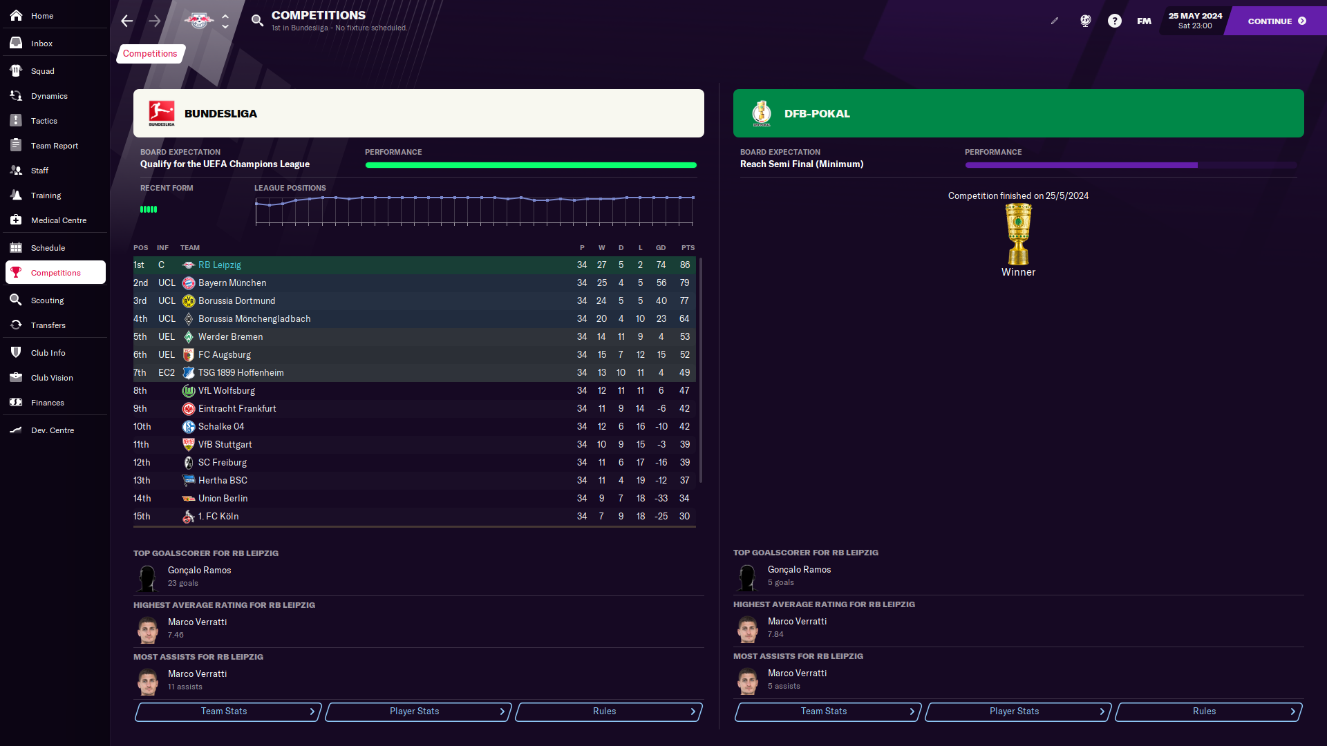 So we head into extra time and I figure we’re going to be really tired and struggle because we’ve played an aggressive up tempo game. Nah. It’s full on Bielsaball. We work our asses off and Bayern fade. 95’: Bierbauer scores again. This time cutting inside from the right to finish. Upamecano converts a Bierbauer freekick with time running out for 4-2 and the cup is ours. Ramos adds a fifth to take the piss because that’s what we do. I’m really going to miss this Leipzig team. It was a special season and I’ve left them in a good place.