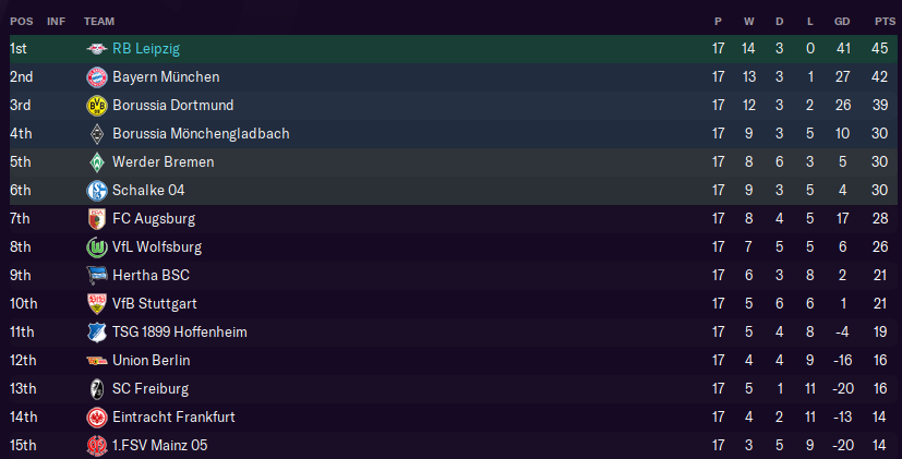 Halfway through the season we’re top, three points ahead of Bayern and six ahead of Dortmund. Which is only due to us beating both of them. No one else is involved. We won at Gladbach (just, 2-1 90+1’ winner), beat Bremen soundly and put seven past Schalke. It’s us, Bayern or Dortmund lifting the Bundesliga. Given my record, I back me.