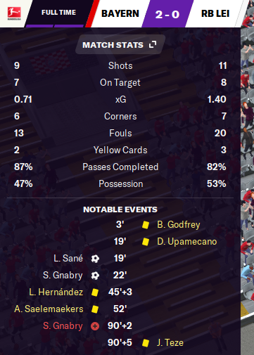 We finish with a 2-0 loss but we have more shots, higher xG, more possession, way more highlights. I feel like this is a big loss in a game we were really unlucky in. Sane’s free kick was unsavable. Gnabry’s break away goal shouldn’t have happened. We were set up perfectly but Teze decided to jog towards the ball instead of staying with his man. If Dest was 100% or Mukiele wasn’t injured, that goal doesn’t happen.