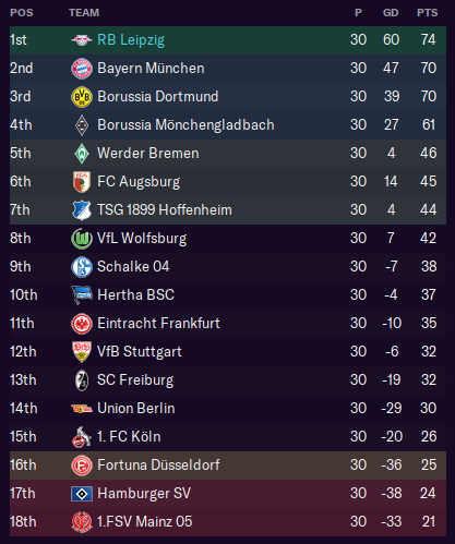 This leaves the league looking like this. A commanding position. Four games left, four points clear, superior goal difference. A chance to win the title with games to spare. Still in the DFB Pokal as well. A reminder here that Leipzig have never won either. Finishing runners up in both. Always the bridesmaids. The last time they won a title was 2013 and that was the Regionalliga Nordost!