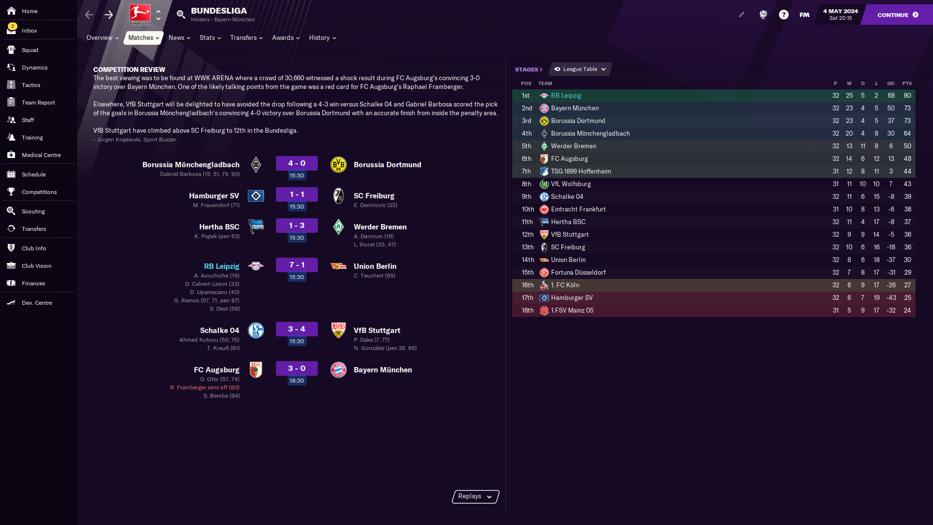We scraped a draw last time so I go all out to destroy Hoffenheim. Wonderkid striker Bierbauer starts. Godfrey is suspended so Konate comes in and he immediately bruises his knee. Somehow this wrecks his ability to function. We go ahead in the opening minute through Ramos. Comfortable all first half. Kingsley Coman then goes off injured. Konate’s mobility is shot and Zirkzee sneaks in behind him for 1-1. We’re super aggressive though and dominate the game. 2-1 thanks to new boy Bierbauer! Konate ends up going off injured and I have to shuffle the back line around. Stevanovic scores for 2-2. We throw everything forward looking for a winner. Bierbauer is clean through on 90+3’ and he puts it wide. I told you he needed to work on his finishing! Points dropped again to Hoffenheim. Why does FM do this? They’re nowhere near as good as us but we cannot beat them. Water bottles thrown at full time. Dortmund, who were losing at HT, win 3-1 at Augsburg and Bayern win their game in hand too. On my match review screen the board give me an F. F’s in the chat.