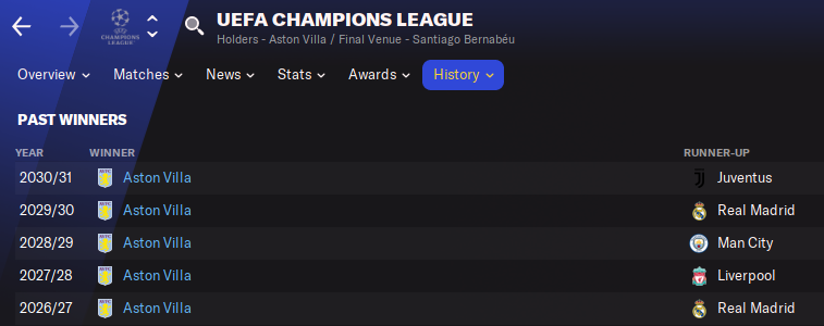 Keep in mind, I won one Champion’s League over the past five iterations of FM and that was with PSG in a Glory Hunter save. Villa won FIVE. In a row!