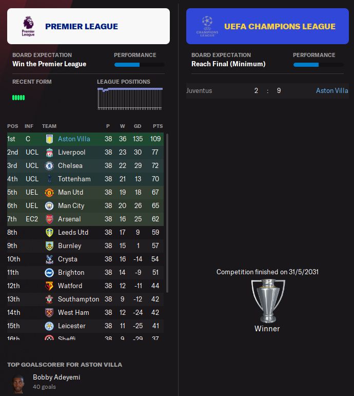 To give you an idea of how insanely good this team is, I’ve put the editor to use and provided here a show of how good the players are. If you’ve never seen the editor; players are rated out of 200. Anything over 170 is considered world class. A few shout-outs among those players. Erik Sergio is the first player I signed at Villa. He cost about £8M and has gone from Brazilian wonderkid centre back to the best defender in the world. At 195, he’s my highest rated player. Bobby Adeyemi is 194 and has scored a staggering 66 goals in the final season. Jesus Sainz, I literally signed in the last season because the transfer budget had a spare £120M in it and the board don’t like me to hoard cash. The team has an average age of 24 and is going to be unstoppable for at least five years.