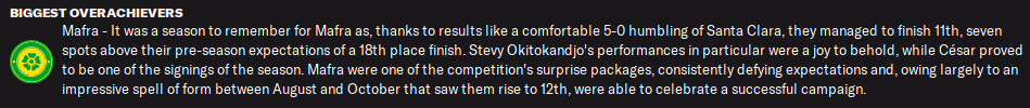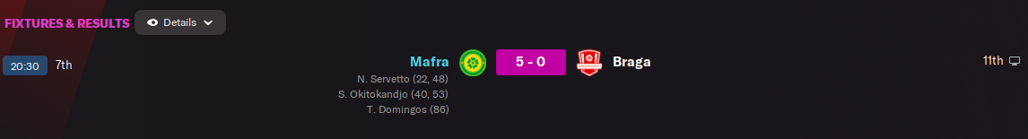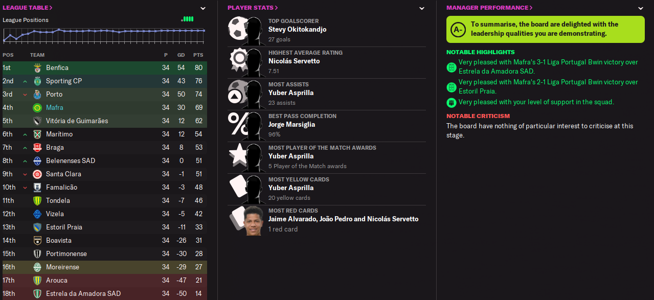 My final thoughts on Mafra is that I leave a job I enjoyed for the most part and I’m a little sad about it. I’m trying to play this save as if it’s a managerial career and I feel like I would leave given the interest in me from a higher level at this point. Leaving Mafra as the fourth best team in Portugal feels like one hell of an achievement and it would have taken a few more seasons before I could crack into the Big Three. Attendances over the course of the season were under 4,000 on average and that’s just not enough fans to sustain a title challenge. They need to build a new stadium and I don’t know where the money for that comes from. Staying at Mafra until the league is won would be a far longer term stay here than I want to do. It would basically be the entire of my FM22 journey. Or almost all of it. It’s time to move on. As with most of my saves I’ve become overly invested in Mafra in the real world. They just got to the quarters of the cup in Portugal and Andrezinho scored as they won a game with ten men. I’ll be keeping my eye on them.