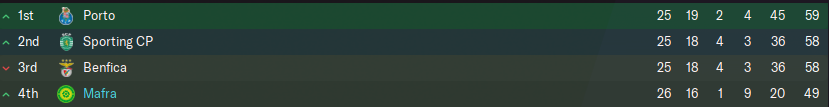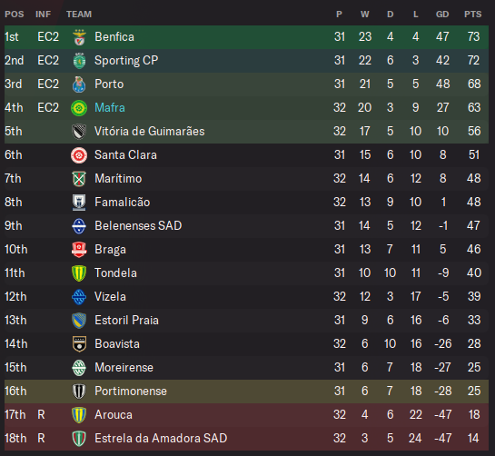 After 26 games played we sit P4. The three horse title race is playing out way ahead of our position but we have enough in the tank to secure European football for next season. An excellent parting gift to a team we took over 2.5 years ago in P16 in the second division. It gets better. We beat our two closest rivals for P4 (Belenenses SAD and Vitoria de Guimaraes) at their grounds in back to back away games. These were not games I was expecting to get anything from and to see us win both makes me very proud of the lads. We’re well behind Benfica, Sporting and Porto but we’re five points ahead of everybody else.