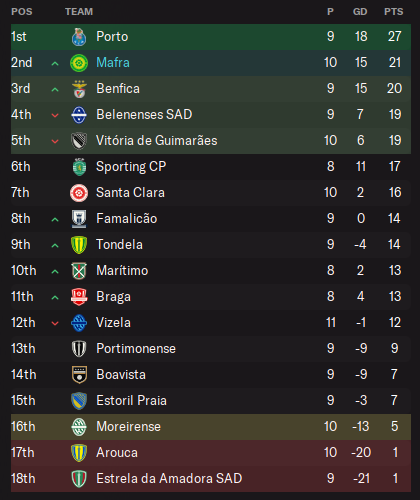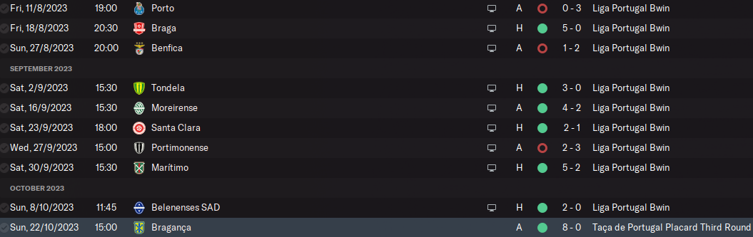 The start of the season threw some tough fixtures our way but we swiftly got into a winning routine. This is all about how we play and how aggressively attacking we are. It doesn’t always work. We should have creamed Portimonense but somehow lost 3-2. I’m thrilled about beating Belenenses though. They’re one of those top six teams (Benfica, Porto, Sporting, Braga, Vitoria, Belenenses + the likes of Boavista and Maritimo) that we need to get in amongst. Beating them, and indeed deserving to beat them, showed how far we’ve come since last year. I think we’re good enough to come seventh, which would be a great achievement. However, if we finish fifth and get European football we can properly overhaul this squad and move on up.