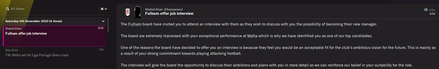 Part of my desire behind this save is to keep it realistic. If I was at Mafra and Villa offered me a job in real life, would I go? I’m pretty sure I would. Whereas Fulham, Stoke, Blackburn etc that have offered me jobs already. I wouldn’t go. I’d rather stay in Portugal. Villa have even said I can finish the season in Portugal.