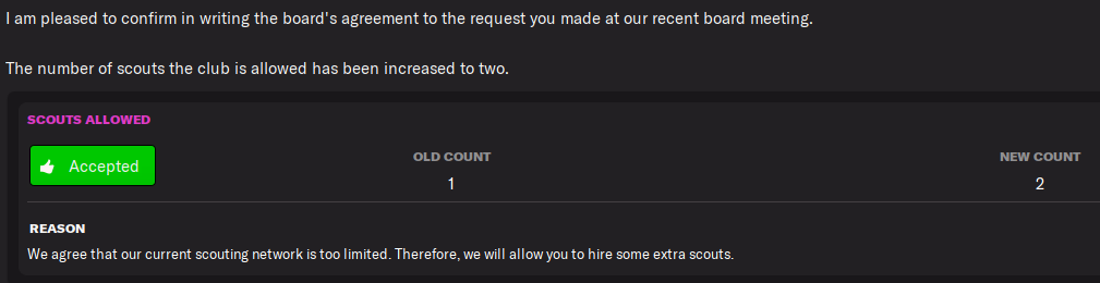 To give you an idea of how tinpot we are…I had to request a second scout. We had one scout. In the topflight of Portuguese football. One. That’s it. You’ll notice it says hire “some extra scouts”. Some = one.