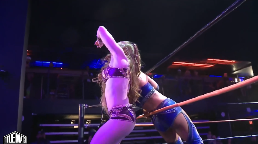 Mimi struggles with her set ups, her selling and her positioning here. She is good at strikes and she plays to the crowd a little more than everyone else on this show. Luck seems proficient at bumping around and working underneath. I’m not sold on Mimi controlling the pace. It feels a bit rushed. It does improve as the match goes on, and she feels less inclined to fill the time with spots and remembers her character. And her character does work. I can feel it. Which is better than a lot of the other robotic performances on this show.