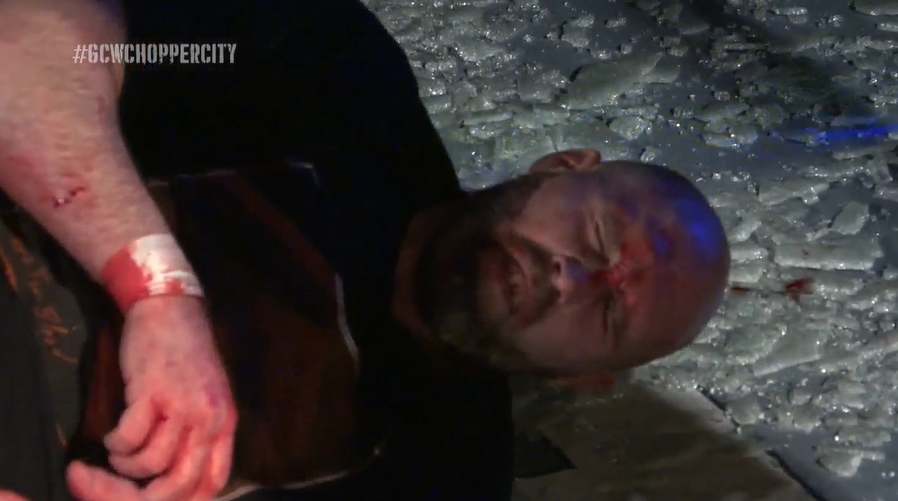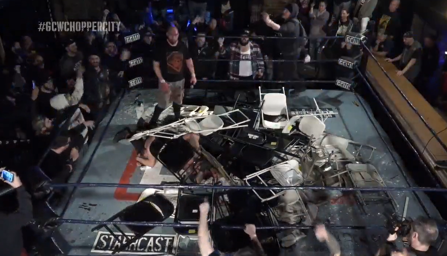 The match isn’t good but it’s a wild environment. They’re basically wrestling on broken glass after ten minutes. Gage wins. I love Gage but it’s more for the atmosphere he creates than the in-ring. This was pretty violent but not a good match. Show ends with the heels being buried under chairs thrown from the crowd.