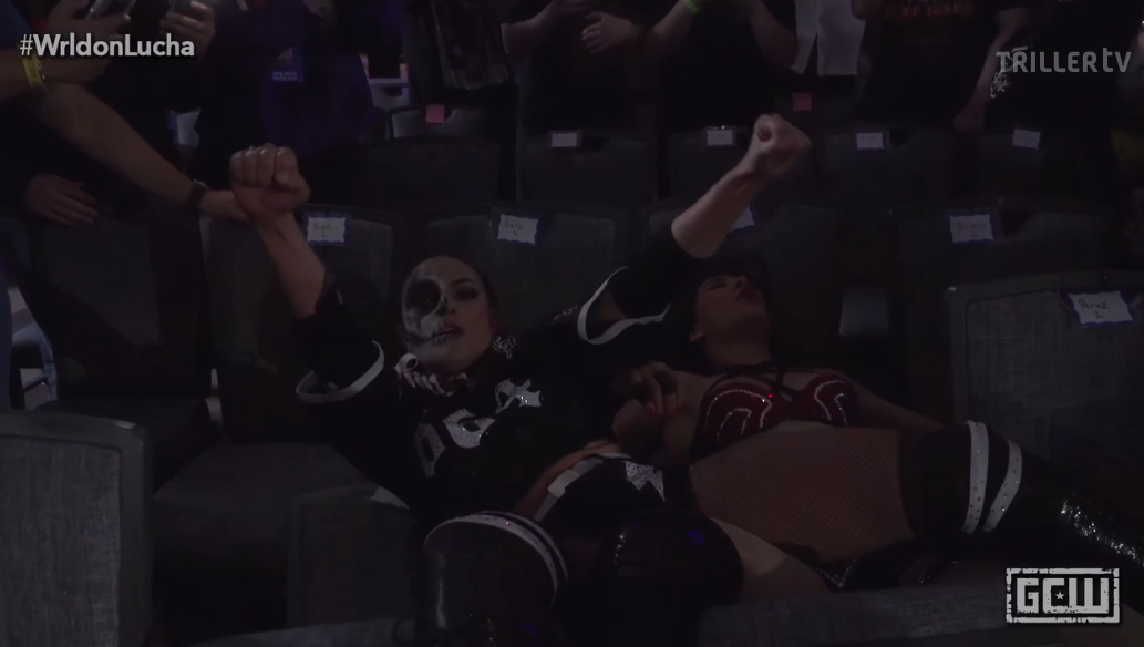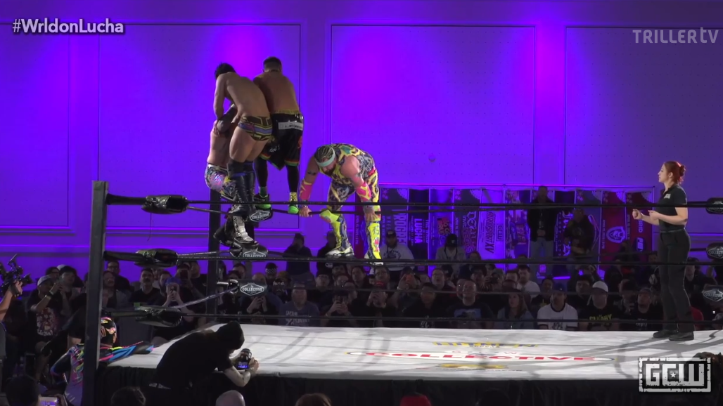 I read “Resplandor” as “Mansplainer” the first time and what a gimmick that would be. I don’t need to look at the screen to know what’s happening. You can tell the moves from all the thigh slaps. KJ Orso and Jimmy Lloyd do a really good job of slotting into the work here. Their spots seem more impactful than the lightweight lucha styles around them. Mansplainer hits an SSP to the floor, after explaining to Dulce Tormenta that she needs to catch him on this spot. KJ Orso steals a pin on Tormenta, and I like that he’s looking around on the pin to see if anyone is going to break it up. **