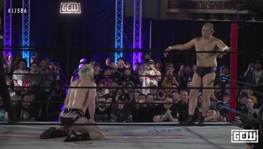 Effy’s mind games don’t work but his unorthodox style occasionally causes Suzuki genuine problems. Effy actually kisses Minoru Suzuki. Like full on the lips. Haha. Suzuki chokes him out, slaps him for it and hits the Gotch Piledriver for the win. He sells the heck out of it too, wiping his mouth on the referee’s shirt. Suzuki gets comedy in ways most people can only dream of. He’s done some brilliant stuff in DDT. Good showing from Effy here. Decent match that worked and popped the crowd. Points for achieving what it set out to and putting Minoru in an interesting match. ***