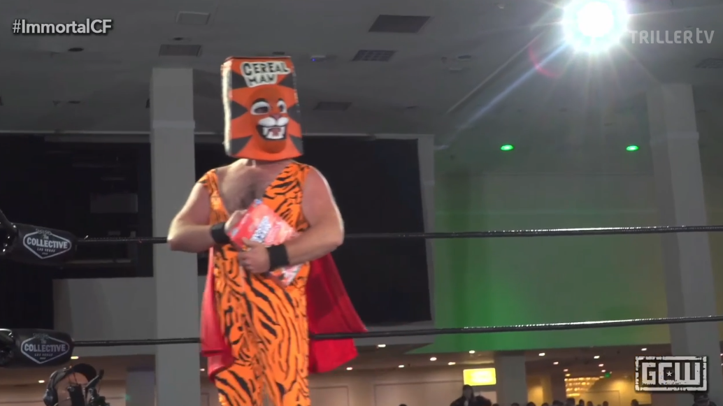There are moments during these shows where I wonder if someone has spiked my water with hallucinogens. As Cereal Man battles Parrow the crowd chant “this is real”. Ah, thank you, my brothers and sisters. The biggest issue with the Clusterfuck is not that they do all this daft shit, it’s that there is too much wrestling in between. I guess the urge is to make the show as long as possible to give the crowd their money’s worth, but I just want the stupid shit at this point.