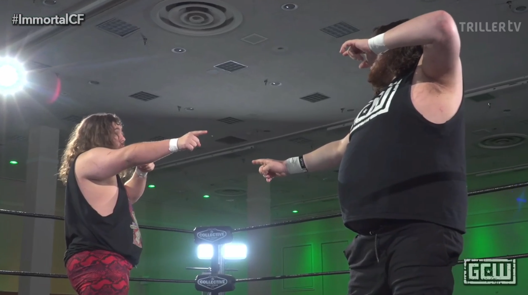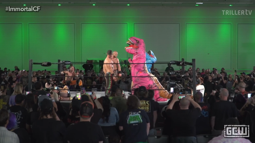 I’ll only be running commentary on fun things. So, normal wrestling stuff I’ll just ignore. Most of the guys at the start are spot guys anyway, although this is an ideal place to just do a bunch of spots. Knock yourself out. Shotzi, who’s been great this weekend, is an early stand out before Nate Webb comes out. His entrance is a highlight of the Clusterfuck every year, so naturally they ruin it by having someone interupt it. This leads to a karaoke section of the match. Amazingly GCW’s microphones work for it. Which naturally segues into a dancing section.