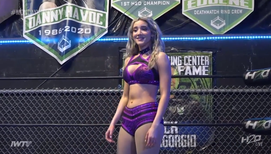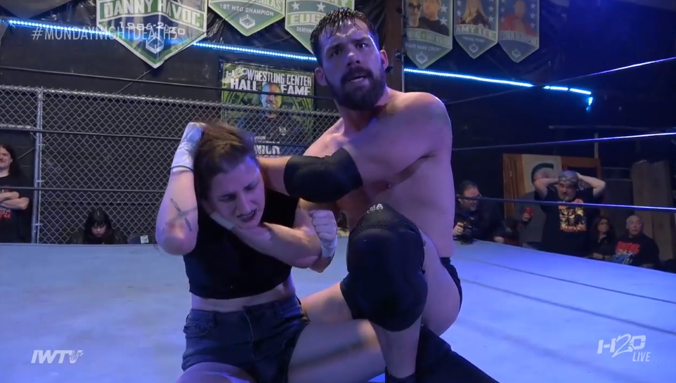 Oh, joy of joys, first match is a goddamn scramble. Killdozer is Matt Tremont in a mask. Kit is wearing red rubber gloves, another reason to hate Roman Reigns. Jess Moss kinda looks like the Waitress from It’s Always Sunny. This is actually a seven-way dance but I can’t get the name of the seventh person because they have no graphic. I can only assume “Rip Craig?” is a late addition. Because what this match needed was more participants.