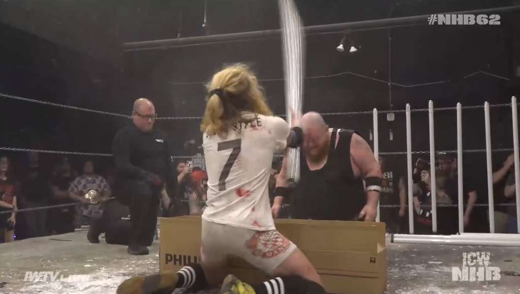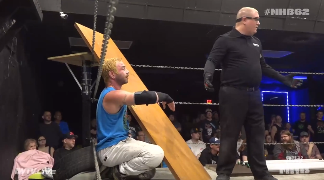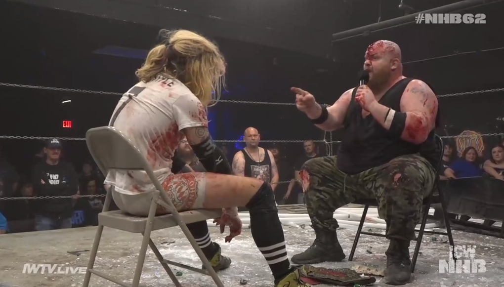 Manhorn is half the size of Tremont, legitimately, and has to throw himself and plunder at Tremont to stand any chance. They do a tug-o-war thing into the post outside and hematomas are likely. Both guys busted open hardway. Kody tries so hard but he’s so small and he can’t do death match stuff. They fuck up multiple tube spots and it’s all on Manhorn. At one point just dropping tubes that Tremont throws at him. He doesn’t look like a big sports guy.