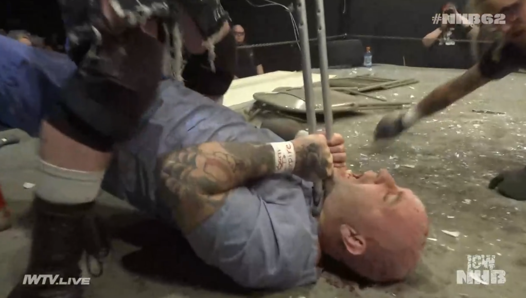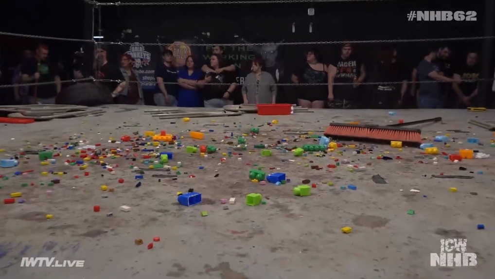 This is not a death match, but it is a mess. Tommy Vendetta has a hell of a match with himself and a chair. They brawl around the building, and we see Dr Redacted waving at the camera from merch. The challengers get staple gunned IN FRONT OF THEIR MOM. When they try to actually wrestle the match completely collapses in on itself. I like MM3 but he can’t do anything right here. Whiffing strikes by a foot. Thighs slapping along for the amusement of the peasants. Piledriver into legos finishes for the champs. Surely, that’s going to hurt your knees more than the girl’s head? Anyway, this was quite bad. Let’s not speak of it again.