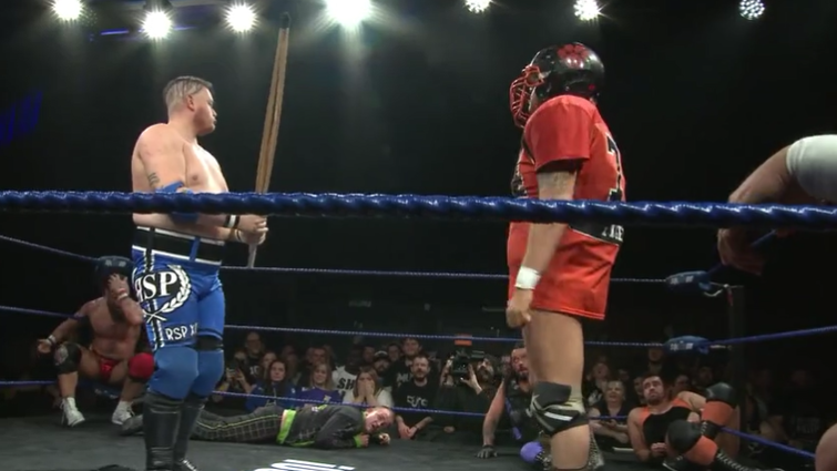 If you don’t know what this match is; it’s the Royal Rumble (with the odd weapon), run a couple of weeks after the Rumble itself for maximum effect. #1 is BT Gunn. #2 is Sami Callihan.