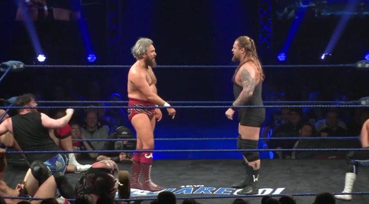 This match is systemic of issues on Indie wrestling. They’re all hairy guys with beards who dress in black. The Purge try and bring some different style by wearing jeans but there’s literally no contrast here whatsoever. They further this by doing a walk and brawl and it’s like Friday night in Glasgow. I mean, it’s literally Sunday night in Glasgow. The crowd brawl becomes even more dull when the camera feed gets cut and everyone sits around bored in the venue.
