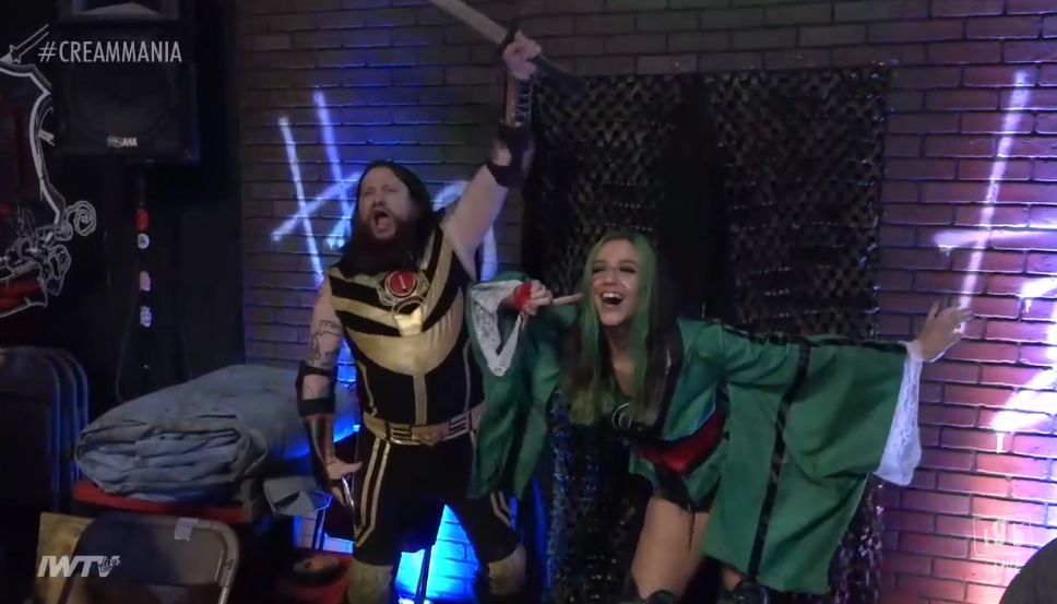 Stan is the CWO leader and comes out wearing some cream Shredder costume. I wonder how much money he blew on that. Demia, on the other hand, has good gear, which would work anywhere. Demia had only debuted just before last year’s Wrestlemania. They do a bit where Stan can’t pick up “Steve the Sword” and Demia easily picks it up. This is followed by shakeweight stuff. It’s a little weird having the leader of your faction be the least serious guy in it.