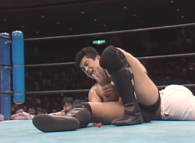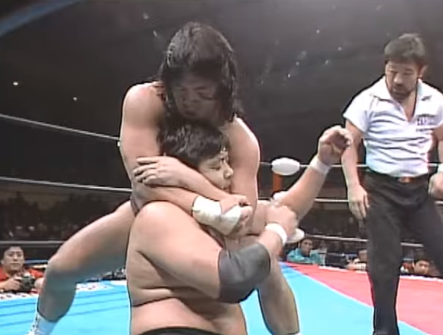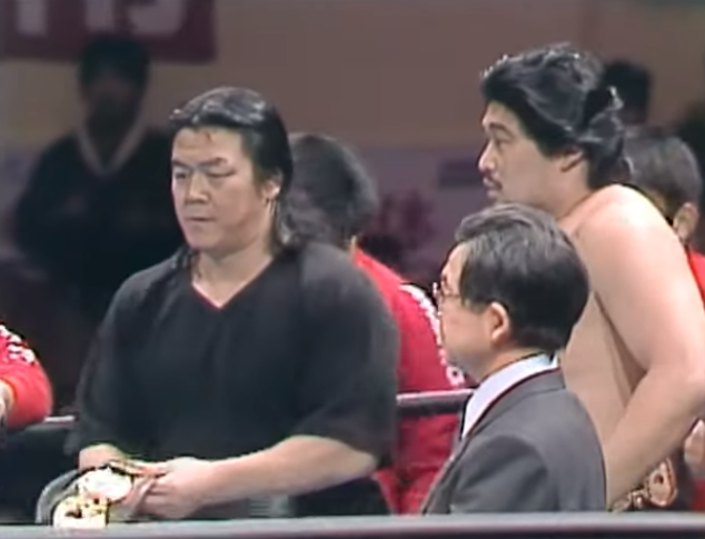 Jumbo is the one who wants those belts in the worst way. He’s coming off the top rope with the big knee! Jumbo always felt like a company guy to me, whereas Tenryu was just there for the shits and giggles.