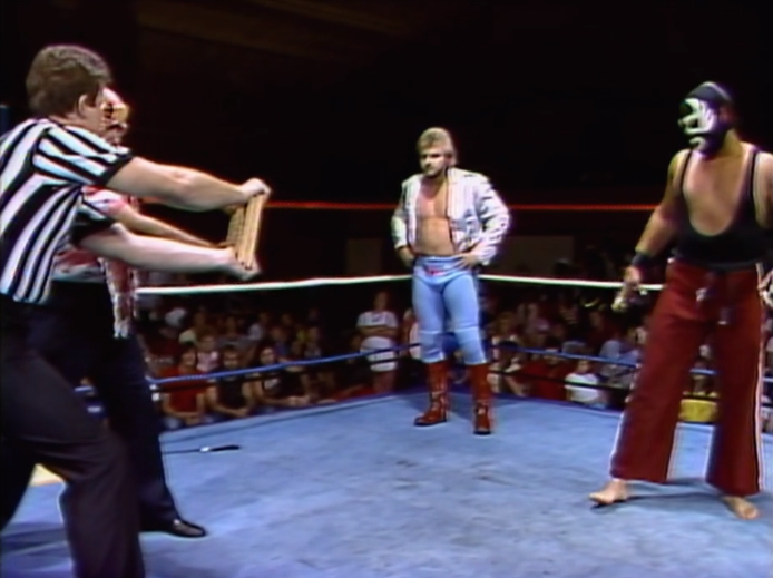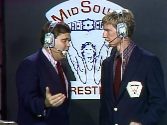 We’re in Shreveport, Louisiana at the Irish Boys Club. Hosts are Jim Ross and Joel Watts. The latter is one of the Watts clan responsible for a lot of Mid-South’s production. Speaking of which, it’s cool production. They get good camera shots, and the editing is clean for 1985.
