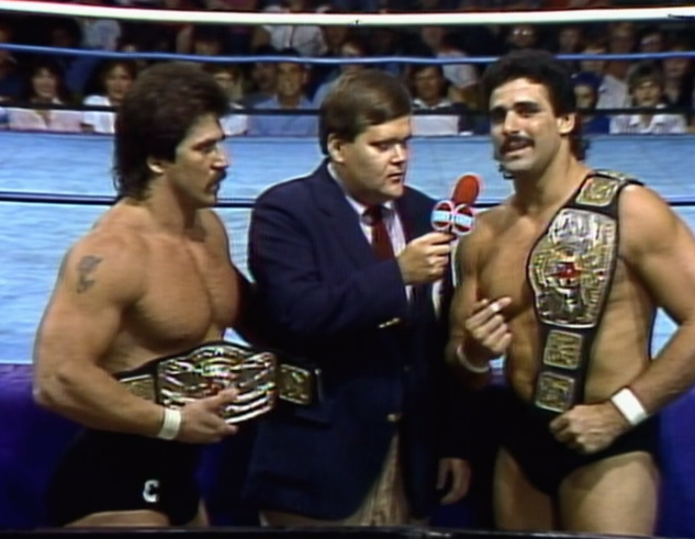 I get briefly excited about Doc vs. Fantastics before realising it’s 1985 and Williams is still fairly new to the business. He got good wrestling in Japan. If this was 1991 Doc (and Terry Gordy) vs. Fantastics, we’d be cooking. We get a screwy match with the ref getting bumped out of the ring, Bill Dundee running in and Doc “loads up” the forearm to bash Rogers for the pin. What is it with wrestling “loading up” stuff in 1985? They were all at it!
