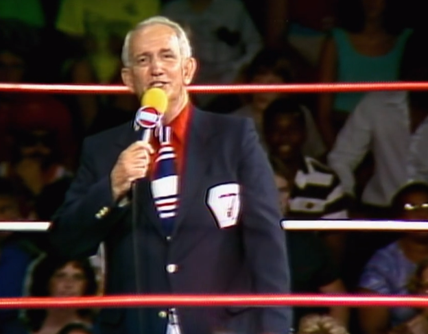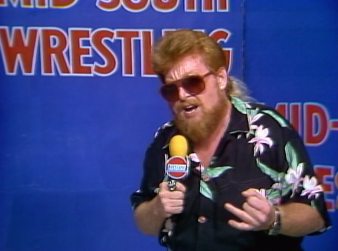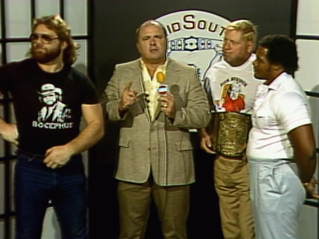 This is Boyd. He was one of Mid South’s announcers in the early 80s. He didn’t stick around for UWF. Bill Watts has Jim Duggan, Dick Murdoch and Butch Reed. Ric Flair has said he’ll only face the North-American champion the next time he’s in Mid-South. That’s currently Murdoch and he apologies to Butch but he won’t be getting a shot at the NWA belt.
