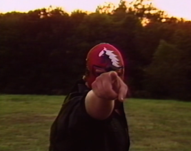 This is madness. He drives a monster truck, a helicopter and a motorbike. Proving that wrestling fans like to see wrestlers drive big vehicles. I think, but I’m not sure, that it’s Bill Watts himself under the mask. Dusty Rhodes famously wrestled as the Midnight Rider, as did Sam Houston.