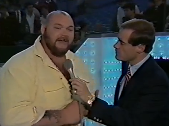 Bam Bam Bigelow gets interview time and accidentally says he’s worked in front of “larger crowds”. He knows he fucked up and starts rambling.