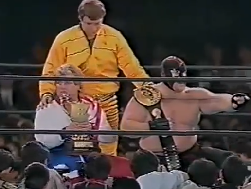 This is advertised as the “Super Powers Combat Championship” but I’m pretty sure it’s the WWF Martial Arts belt. It was Inoki’s belt, given him by Vincent McMahon Senior. He’s held it for 10 years.