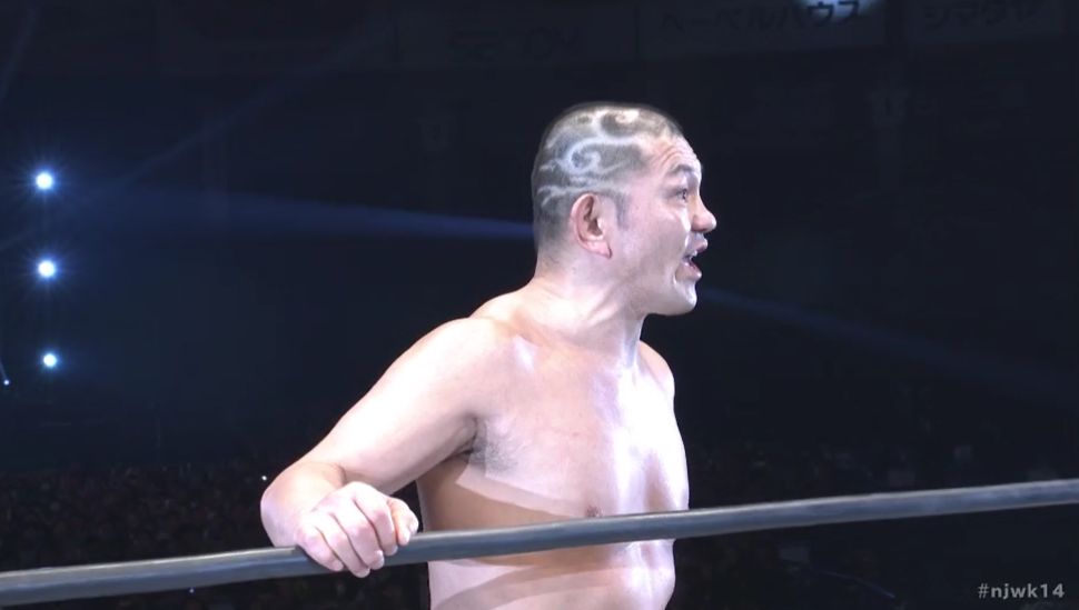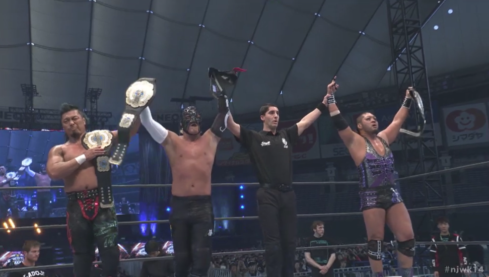 New Japan World experienced some streaming issues after the last match so my Twitter TL was loaded with various complaints about how long it took to come back up. Mine returned during the entrances here so I missed no action. This is a very flippy match but with added dickishness from ELP. The rope walking moonsault back rake is wonderful. Taiji Ishimori is an outstanding pro-wrestler so I’m glad they managed to shoe-horn him onto a Dome show. Then we have powerhouse SHO and his stacker German suplexes on both opponents. The man is a Hoss. A miniature, muscular Hoss but a Hoss nonetheless.