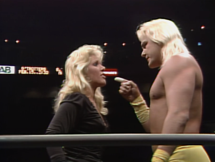 Barry’s made up belt is on the line here. The title reserved for people who had banging matches with Ric Flair but can’t do it with anyone else. Larry is cornered by Baby Doll, in the short spell she had back there before Crockett decided not to employ someone whose partner (Sam Houston) was working for the WWF. Vince McMahon did give her a shot, as he was looking for lady wrestlers in 1988, but she never caught on.