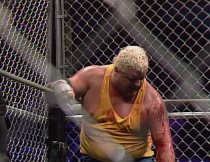 The concept is so deliciously stupid. You have to throw someone over the top of the cage to get them gone and then there’s this huge bump to the floor, which no one should be taking. We spend about 15 minutes with everyone hugging the ropes, punching and bleeding. The pace picks up when Luger mounts a comeback and obviously Dusty has to scoop his heat by doing the same thing right afterwards. Dusty was such a selfish wrestler in the late 80s. I’m glad he was able to redeem himself in retirement by helping a new generation of workers. Maybe he felt guilty.