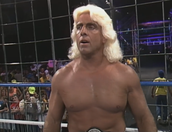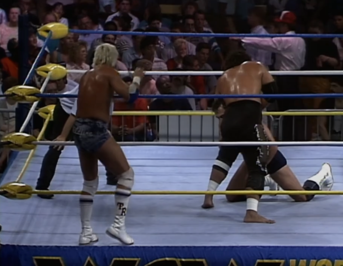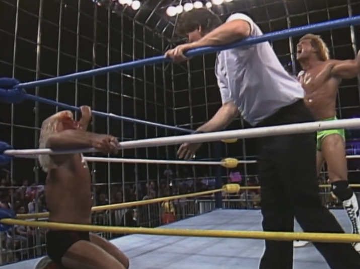Woman is allowed inside the cage, which seems like a bonus for Naitch and the ref checks her to discover she has an “international object” (called so by Ross) in her glove. Luger comes in with a legitimate staph infection in his knee, but they couldn’t put him out injured with Sting already sidelined, so he’s working through it. Flair bumps around a bit and chops away. The Flair Formula started coming into play in a BIG way in 1990. I’m not saying Ric got lazy, but his heart wasn’t in it anymore. Blame Big Jim Herd, I guess.
