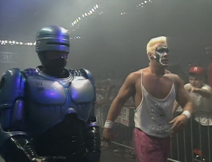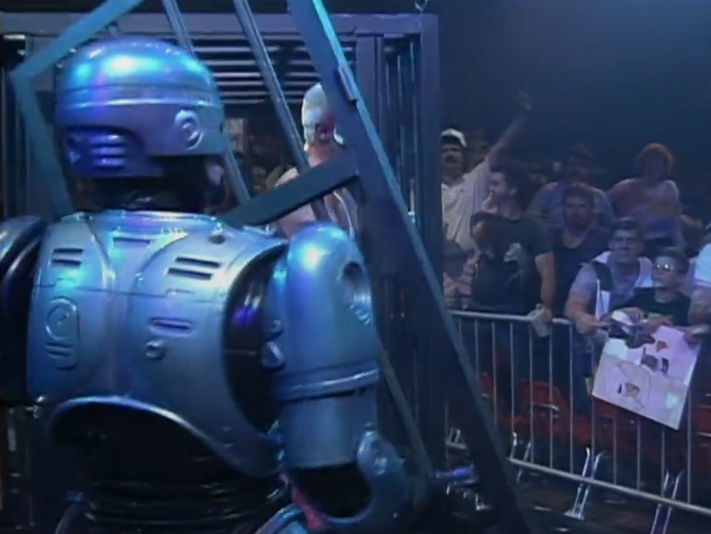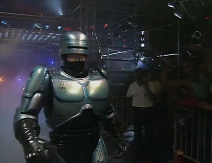 Oh, I forgot about Robocop! So, this show was a movie tie-in with the release of Robocop 2. The original Robocop movie (1987) had been a huge hit. Turning a $13M budget into $50M+ at the box office. A series of strikes and script problems delayed the sequel and Paul Verhoeven, director of the original, stepped out to make Total Recall instead. Orion, the production company, got very ‘hands on’ with Verhoeven out of the picture and tried to market the film to a wider audience. The cartoonish sequel was still a modest hit. Making around $15M in profit. In order to help push the movie, they’ve agreed a tie-in here with Robocop making an appearance at the PPV. There was a rumour WCW paid Peter Weller $150,000 to appear on this show but a) that’s bullshit and b) Weller isn’t even on the show, as was confirmed by Sting in an interview years later.