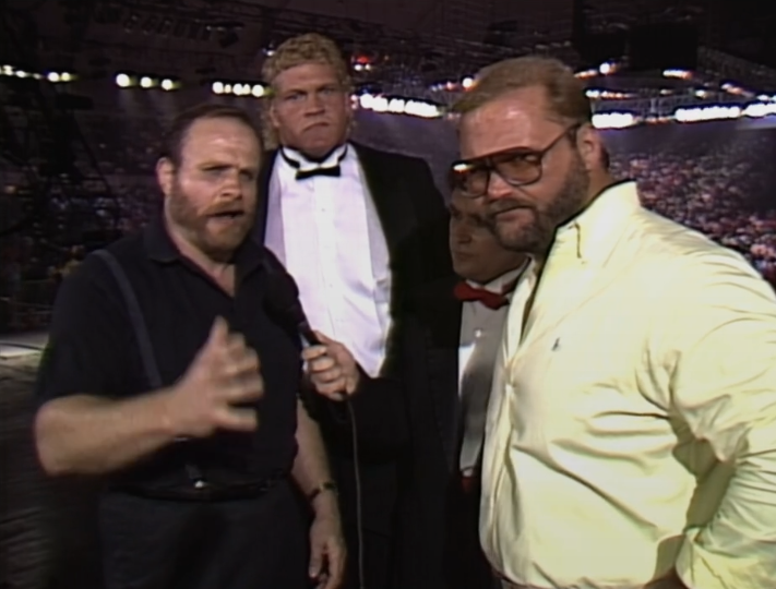 The Horsemen get an interview and Ole being booker means lots of Ole talking. Flair arrives to tell us he’s going to remove Lex Luger’s leg and finish his career. The Horsemen all have sports shirts on apart from Sid, who’s not got the memo and is wearing a tuxedo.