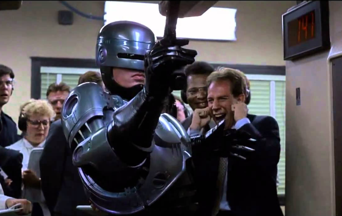 While he’s walking down here, I put on the theme from Robocop, because it’s awesome and it takes him a while to get here.