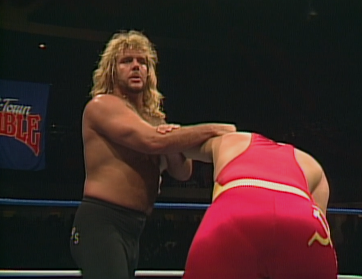 JR starts getting very excited about the collegiate backgrounds of both men. Rotunda held the belt for a year before losing it, in a heated contest, at Starrcade. I described that Starrcade match as “boring at times”, which is Michael Rotunda to a tee. During his 1988 TV title run he arguably had the most exciting matches of his career.