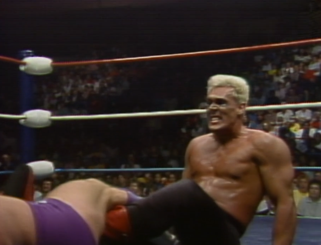 We’re getting confusing rules here. A one-count is a pinfall and we’ve got a rounds system. It’s because Rotunda is in the Varsity Club. He beat Nikita Koloff for the belt in January. He’s trained by “Gamesmaster” Kevin Sullivan. Who looks like a deranged wizard but is actually an amateur wrestling coach, or something.